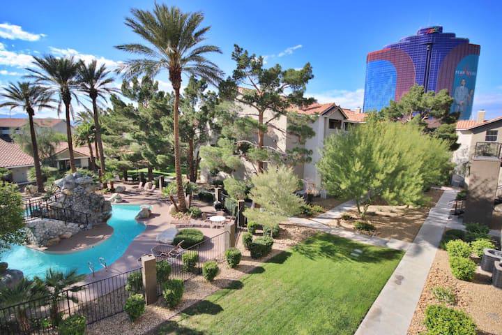 Tucked just moments away from the dazzling lights of the Las Vegas Strip, Flamingo Palms Villas offers a serene escape from the city’s non-stop energy. Within our gated, palm-lined community, you’ll find a peaceful blend of comfort, elegance, and convenience — the perfect home base for everything from quick getaways to extended stays.